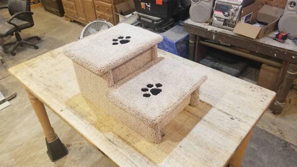Custom Handmade to Order Dog Stairs! We are the first and original sellers of dog stairs on Etsy. We use all wood & screw construction and first grade quality plush carpeting. Support a small family-owned business while purchasing a long-lasting piece of pet furniture for your furry friend.